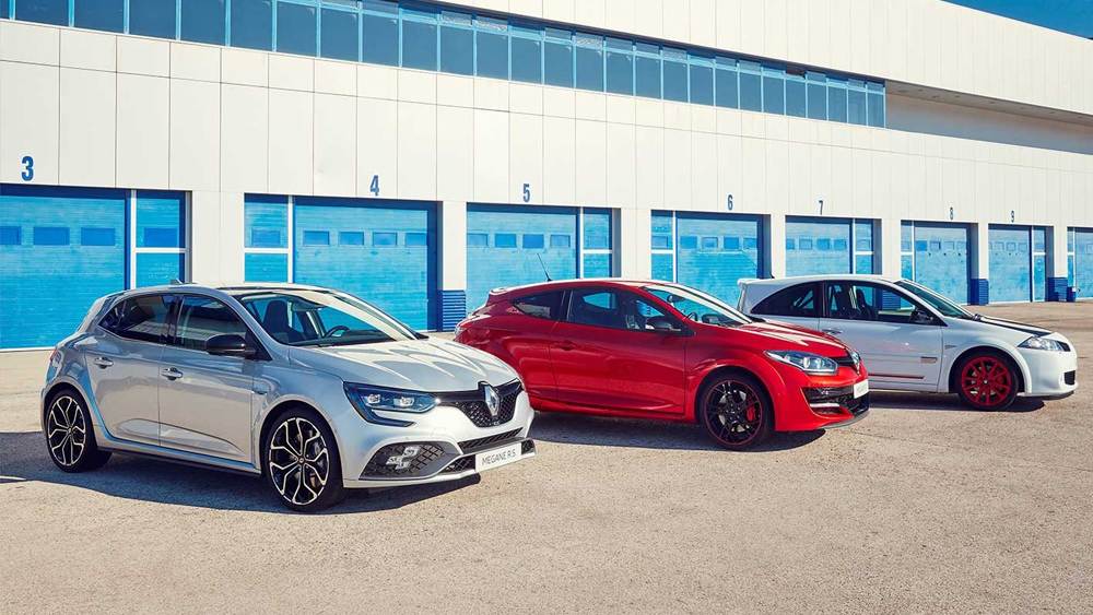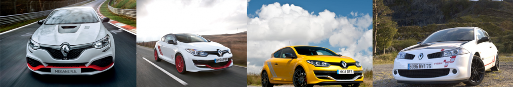 Fratele sau mai mare Megane a primit cu Renault Sport un tratament asemanator. Primul Megane RS a aparut mai tarziu ca fratele sau mai mic, prin 2004, fiind bazat tot pe a 2 a generatie a modelului. Primul Megane RS a fost vandut doar in varianta hatchback cu 2 usi acesta oferind un motor 2.0 turbo cu 4 cilindrii si 225 de cai putere. Acelasi model a primit si varianta F1 cu 230 de cai putere, folosind elemente de design si coloristica putin redesenate. Renault Sport a construit la aceasta generatie si un model Trophy gandita pentru curse de raliu, aceasta folosind un motor de 3.5 litri V6 de 330 cai putere. In 2010, odata cu a 3 a generatie de Megane, Renault trece la un alt nivel din toate punctele de vedere, iar Renault Sport transforma banalul Megane Coupe intr-o varianta de 250 de cai putere tot dintr-un motor de 2 litri. Acesta are frane Brembo, un body kit foarte agresiv si jante pe 18. La fel ca in cazul lui Clio si acest Megane a aparut in perioada in care nivelul masinilor Renault a ajuns la alte standarde. Pe parcurs, acest model a primit si versiuni imbunatatite, cea mai puternica numita Trophy R (RS 275), a primit 275 de cai putere. Renault a lansat in 2017 cea de-a 4 a generatie al faimosului model Megane RS, acesta avand un motor mai mic de data asta, de 1.8 litri turbo cu pana la 300 de cai putere. La aceasta generatie s-a adaugat si tehnologia 4CONTROL, imprumutata de la modelul Laguna Coupe din 2008, prin care rotile din spate se curbeaza in acelasi timp cu rotile din fata pentru viraje mult mai precise. Deci daca vedeti modele noi de Renault cu rotile din spate virate, nu va speriati, nu sunt stricate, doar au tehnologia 4CONTROL.