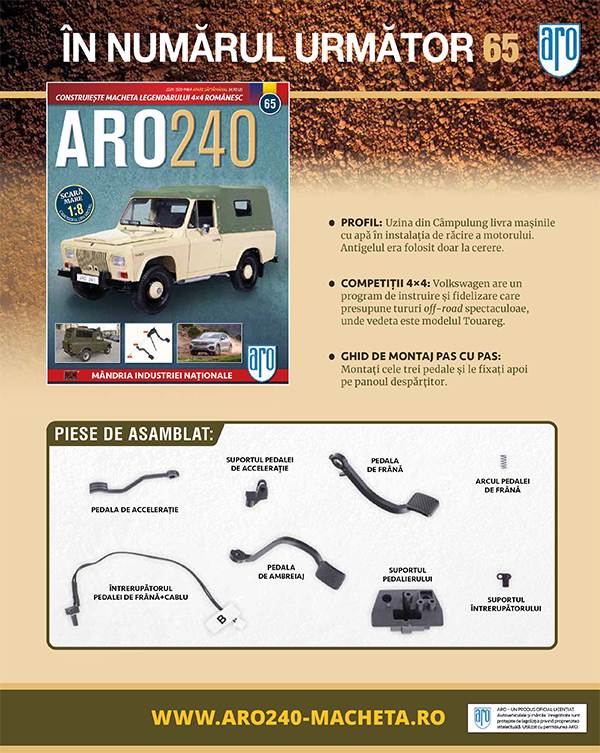 Hai ca am facut-o si pe asta, am ajuns oficial la jumatatea machetei noastre ARO 240. Un drum cu anumite limitari, dar care nu au tinut de vointa noastra, care totusi ne-a oferit ceva frumos. Spuneam ca dupa ceva mic, vine ceva mare, astfel in numarul 64 primim o piesa foarte mare care reprezinta panoul dintre motor si habitaclu. Piesa este metalica, bine definita si montam pe aceasta un regulator de tensiune. Deocamdata atat pentru numarul 64. Pentru ca au fost mici intarzieri cu piesele, am montat doua numere intr-unul si vorbim putin si despre numarul 65, in care primim pedalierul si switchul care activeaza stopurile pe frana. Acest numar contine cele 3 pedale (acceleratie, frana si ambreiaj), suportul pedalierului, suportul pedalei de acceleratie, cablajul pentru switchul de la frana, suportul acestuia si un arc care va mentine pedala de frana pe pozitie.