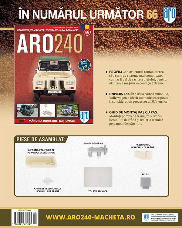 Continuam cu montajul pieselor pe panoul de la numarul 64. Astfel in numarul 66 primim mai multe piese mici, suport pentru pompe, pompa de frana, recipientul lichidului de frana, capacul acestuia, izolatie termina si un releu. Se pare ca ne vom ocupa de interior, iar luna martie care anunta inceputul primaverii cu siguranta va fi plina de surprize.