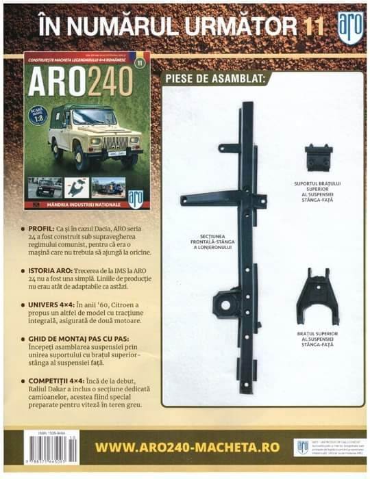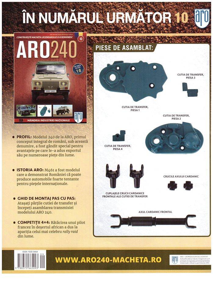Stiu ca sunteti cu sufletul la gura in fiecare saptamana si asteptati cu nerabdare sa vedeti ce urmeaza in urmatorul numarul al mult indragitei machete Aro 240. Asa suntem si noi pentru ca il construim impreuna cu voi, iar azi am pus mana pe numarul 10. Am construit deja o buna parte din motor si cutia de viteze astfel in numarul 10 ne apucam de transmisie. ARO 240 este primul model conceput integral de romani si are tractiune integrala. In numarul 10 gasim urmatoarele piese: cele 4 piese care intregesc cutia de viteze (transfer), axul cardanic, cele 2 cuple aferente axului si crucile sale.