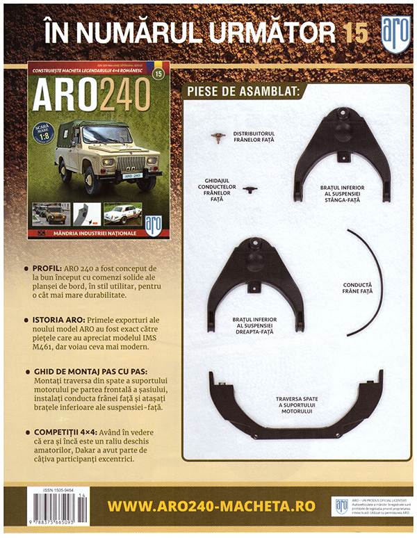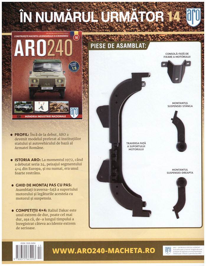 Am ajuns la numarul 14, iar dupa ce am montat suspensia fata pe partea frontala a sasiului, ne apucam sa montam traversele cadrului motor putin cate putin. Numarul de saptamana aceasta ne arata cum sa montam traversa fata a cadrului motor, consola fata de fixare a motorului si cele doua montante ale suspensiei de pe ambele parti. Aflam cum modelul Aro a fost foarte bine primit si a devenit imediat modelul preferat al Armatei Romane si al institutiilor statului. De asemenea aflam ca atunci cand Aro era deja pe piata, segmentul 4x4 din Europa era foarte limitat. Povestirile despre raliul Dakar nu se opresc aici si aflam despre cateva din accidentele extrem de grave care au avut loc de-alungul timpului, acest sport fiind foarte periculos.
