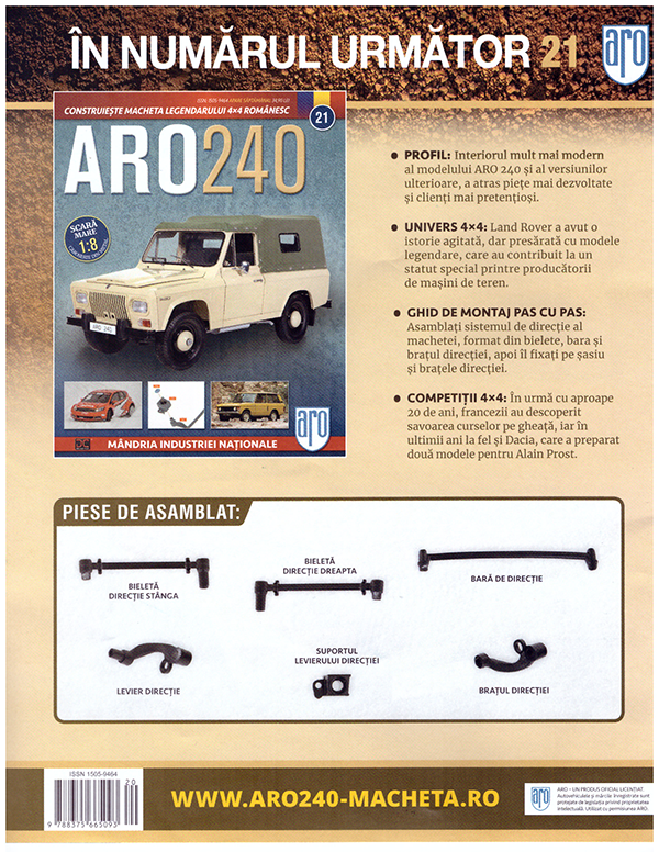 Am ajuns si la numarul 21, in care continuam sa completam partea de directie. Daca la numarele anterioare i-am pus prima roata si ne-am ocupat putin de directie si de fuzeta dreapta, acum incepem sa montam sistemul de directie si acesta fiind foarte complex. Montajul este complex, nu este greu, dar necesita atentie la ilustratiile din revista pentru ca poate fi derutant si se pot monta piese in pozitii gresite. Ansamblul final arata foarte ciudat, dar montat pe sasiu, este ce trebuie.