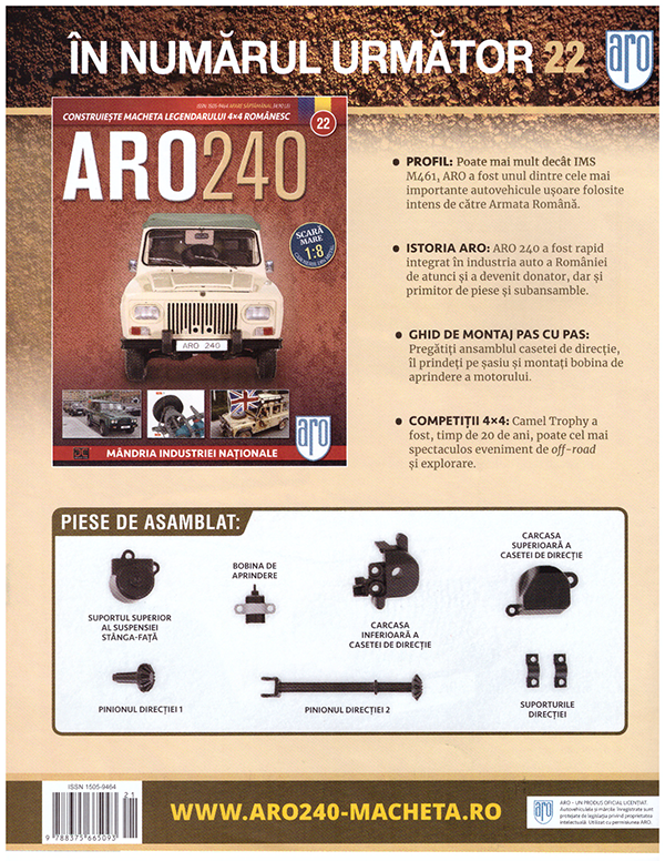 Pe spatele numarului 21, vedem ceea ce vom avea de facut cu numarul 22. Montam tot piese de la directie dar si bobina de aprindere. Piesele din numarul 22 sunt: suport superior suspensie stanga- fata, carcasa inferioara si superioara a casetei de directie, bobina de aprindere, pinionul directiei, pinionul directiei 2 si alti doi suporti pentru prinderea directiei.