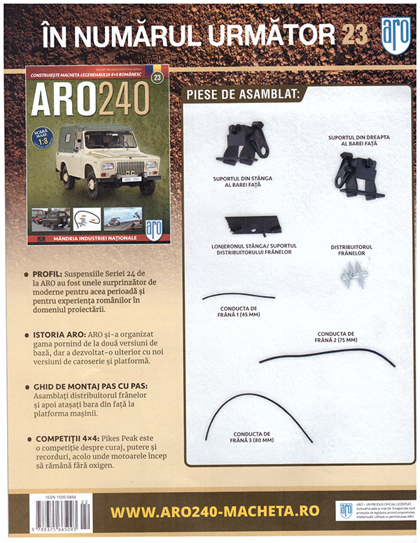 Ajunsi numarul 23, facem un pas important, montam o piesa pe care am primit-o la inceputul colectiei si pe care a cam umplut-o praful. Este vorba de bara fata. Aceaste se monteaza folosind suportii din pachet si suruburi de montare pe capetele de lonjeroane. Piesele din numarul 23 sunt: suport stanga-dreapta al barei fata, o portiune din lonjeron stanga, distribuitorul franelor, si 3 conducte de diverse dimensiuni si grosimi pentru frane.