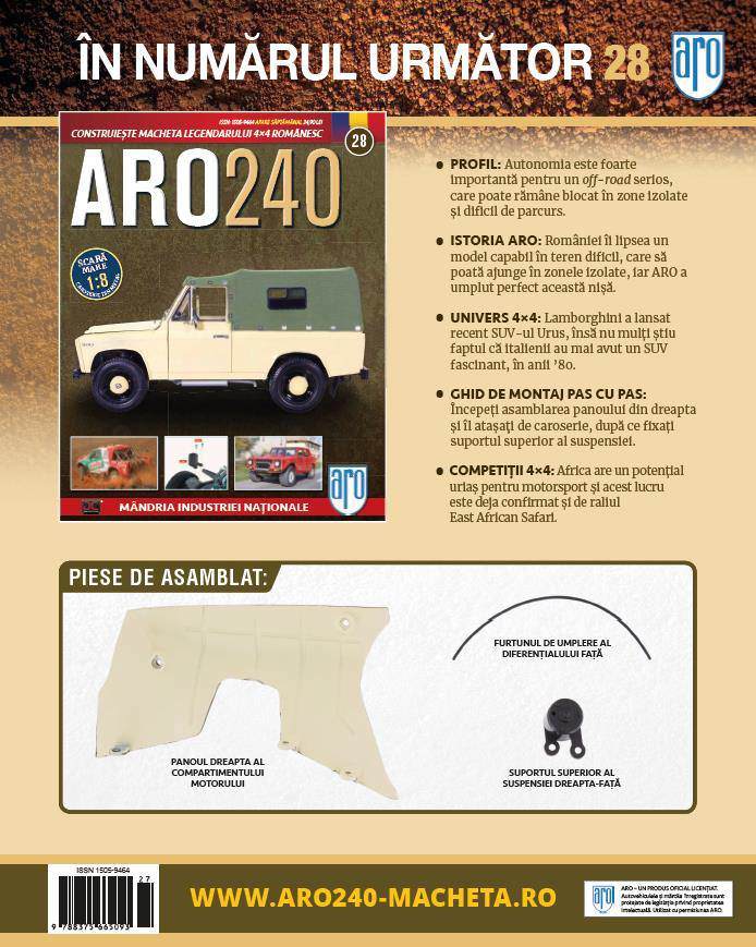 In numarul 28 completam si mai mult ce am inceput deja in numarul 27, adaugam panoul din dreapta al comportimentului motor, dandu-i o forma si mai interesanta machetei noastre. Primim contraaripa dreapta a compartimentului motor, suportul superior a suspensiei dreapta fata si furtunul de umplere al diferentialului fata.