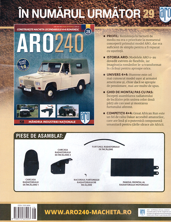 Dupa ce am montat compartimentul motor, ne mutam in interiorul sau si incepem montajul pieselor de pe contraaripi. In acest numarul 29 primim carcasele radiatorului de incalzire, furtunul si racordul radiatorului de incalzire si partea din fata a radiatorului motorului. Cele doua carcase ale radiatorului de incalziare se monteaza una cu alta, iar racordul il atasam acesteia impreuna cu furtunul. De aici facem o pauza, aceste piese montate si panoul radiatorului motorului, vor sta deoparte pana la urmatorul numar.