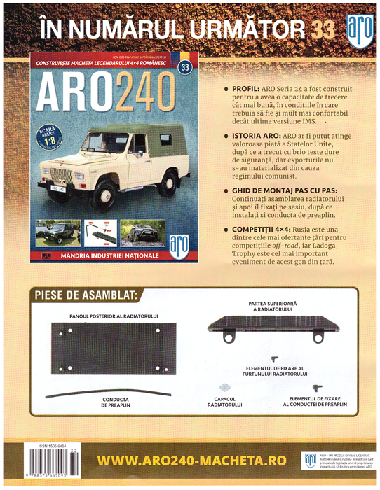 Ajunsi la numarul 33, am trecut oficial de primul sfert al colectiei. In acest numar intregim partea din fata a componentelor radiatorului motorului. Primim: panoul posterior al radiatorului, conducta de preaplin, partea superioara a radiatorului, elemente de fixare ale conductelor si capac radiator. Cu piesele care au stat pe bara din numerele trecute, intregim radiatorul motorului si atasam si suportul elicei pe acesta. Atasam furtunele lichidului de racire si conductele de apa ramase in aer la numarul trecut.