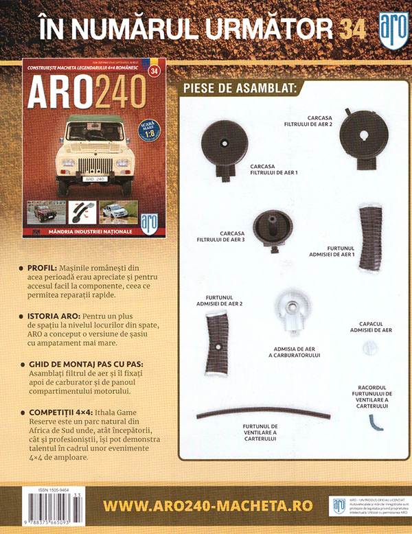 Mergem mai departe cu numarul 34, unde adaugam probabil si printre ultimele piese din compartimentul motor, ansamblul filtrului de aer. Avem urmatoarele piese: carcasele filtrului de aer (3 bucati), furtunul admisiei (2 bucati), admisia carburatorului, capacul admisiei, furtunul si racordul pentru ventilarea carterului.