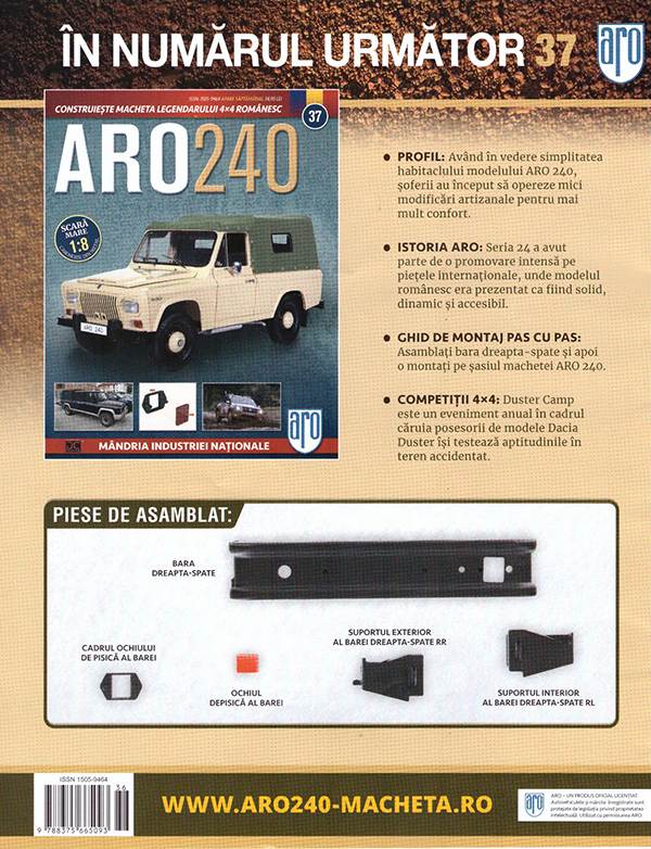 Dupa ce am trecut la definirea partii din spate a machetei ARO 240, continuam cu montajul pieselor din partea posterioara. Astfel, in numarul 36 primim prima parte a barii spate. Bara fiind compusa din doua bucati separate, producatorul ne ofera prima parte a barii, cea din stanga. Ca piese avem: bara stanga spate, ochiul de pisica cu rama sa si cei 2 suporti de prindere pe sasiu. Cu cateva rotiri de incheietura, montam partea din stanga a barii pe cadrul de fier din numarul trecut.