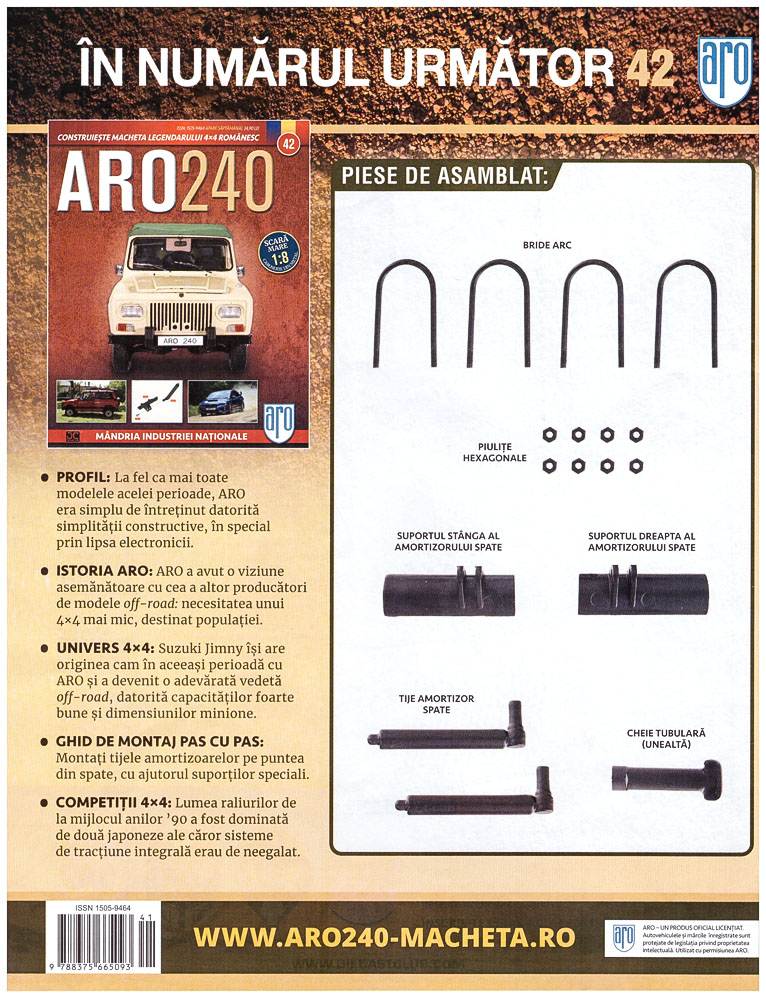 In numarul 42, incepem sa intregim subansamblele puntii spate. Montam tijele amortizoarelor cu suportii lor si bridele arcurilor. Arcuri? Hmmm, suna promitator pentru viitoarele numere. Primim si 8 piulite hexagonale, dar si o cheie tubulara pentru acestea. Tare, nu?