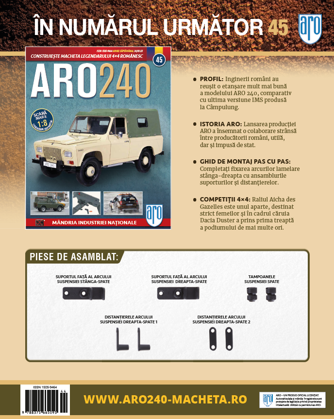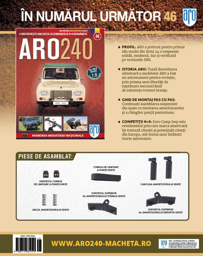 Dupa ce am montat arcurile lamelare si am conectat axul cardanic, a venit momentul sa prindem puntea de sasiu. Astfel in numarul 45 primim cei doi suporti dinspre fata si cei doi suporti dinspre spate pentru arcurile lamelare. Pe langa asta, montam si tampoanele suspensiei pe sasiu. Prin acest montaj, puntea spate si axul cardanic devin aproape complete si montate de sasiu.