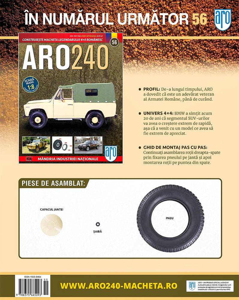 Am stat destul pe butuci, a venit momentul odata cu numarul 56 sa punem macheta noastra pe toate cele 4 roti. Primim anvelopa, capacul jantei si o saiba pentru rotatie. Montajul este simplu, il vedem mai jos in videoclipul montat de colegul nostru, dar in mare avem janta de la numarul trecut cu jumatate de tambur montat pe aceasta, janta la randul ei fiind din doua bucati. Montam jumatate pe partea cu rotatia si cealalta jumatate pe parea opusa astfel incat sa pice in singura pozitie posibil pentru montaj. Cu un surub cu saiba si saiba din plastic montam roata pe fuzeta si adaugam capacul prin apasare.