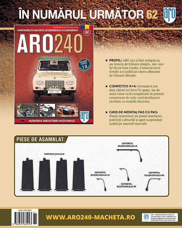 Faimoasa buturuga este acum inlocuita de 4 cale din plastic, asa cum sunt obisnuiti de Eaglemoss la fiecare macheta. Cele 4 cale sunt ceva mai inalte de data asta, fiind vorba despre o masina de teren cu garda inalta. Pe langa aceste cale, primim si 4 suporti care arata ca niste chingi cu care era prins rezervorul de sasiu. Cele 4 chingi au forme diferite, dar exacte pentru decupajele din rezervor si se pot monta intr-o singura pozitie. Astfel, in numarul 62 atasam rezervorul pe sasiu si conectam furtunul de combustibil pe acesta. Furtunul ramasese in aer cu cateva numere in urma.