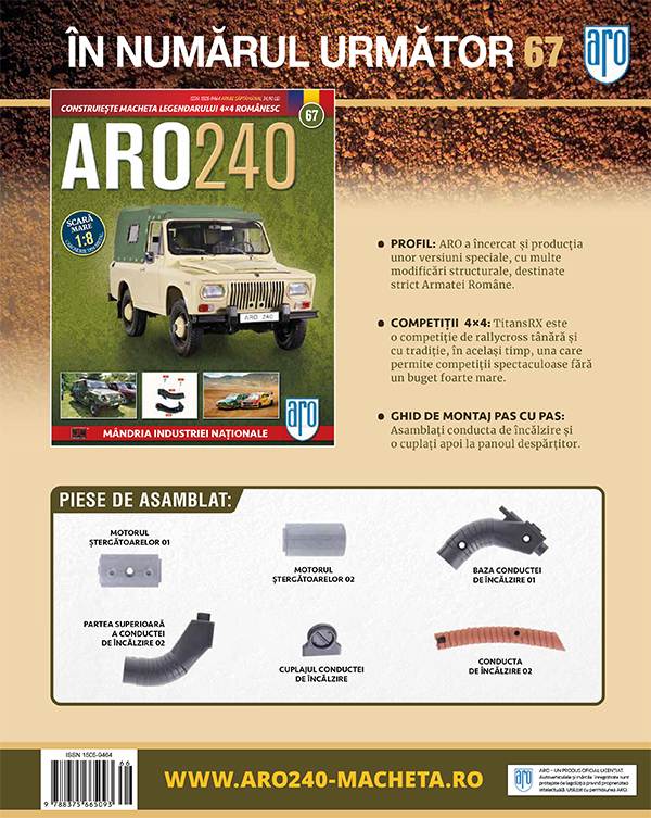Trecem la primul numar din a doua jumatate a colectiei, numarul 66 si continuam cu montajul pieselor gasite pe panoul despartitor. Este vorba de pompa de frana, suportul acesteia, rezervorul lichidului de frana, capacul acestuia, o izolatie termina si un releu. Toate aceastea se monteaza foarte simplu pe panoul primit la numarul 64 si asteptam cuminti urmatoarele piese.