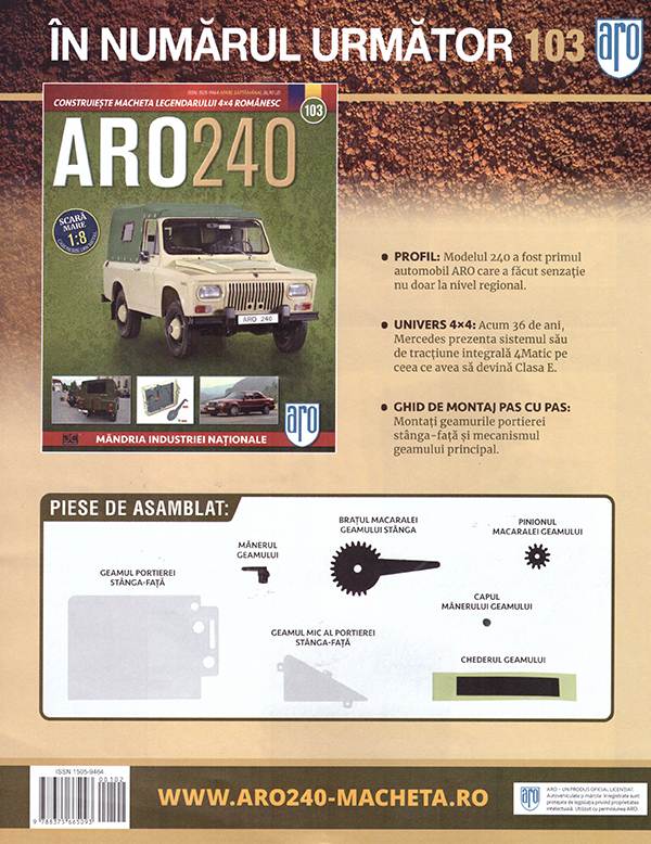 Schimbam prefixul oameni buni! Macheta noastra mai are putin si este completa, iar cu acest pachet al abonamentului trecem de cifra 100. Pachetul 24 ne dezvaluie prima usa, astfel in numarul 99, primim usa propriu-zisa si balamalele. Montam balamalele pe usa intr-o anumita pozitie si desfacem urmatoru numar. Numarul 100 vine cu oglinda, manerul si incuietoarea, dar si o imitatie de cheder care se lipeste. Oglinda pare destul de solida, corpul sau fiind gros, astfel plasticul nu este firav. Montam oglinda dupa ce o asamblam, lipim chederul de usa si aplicam incuietoarea cu arcul sau. Simplu. Trecem mai departe la numarul 101 si vedem fata de usa, cu cotiera usii si buzunarul. Le prindem intre ele cu suruburi si trecem repejor la numarul 102. Acolo avem cadrul interior al partii inferioara ale usii si manerul de deschidere. Toate acestea se prind rapid intre ele si le lasam separat de usa pana la pachetul urmator.