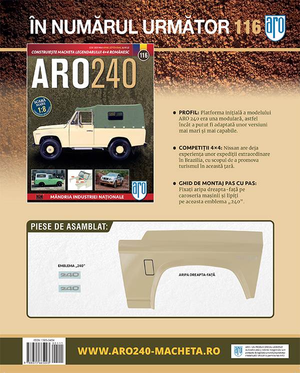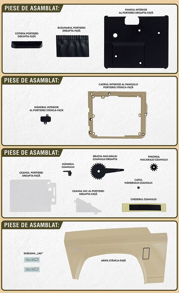 Fara nici o alta pauza, colectia ARO 240 intra in ritmul normal si deja vorbim despre urmatorul pachet care intregeste si mai mult forma finala a machetei noastre. Daca in ultimele numere ale pachetului 26, am inceput sa construim usa din dreapta, acum o finalizam si montam pe caroserie. Stim deja, poate unii dintre voi de la alte machete, atat locale, cat si internationale ca o usa tine minim 3 numere, si in cazul lui ARO dureaza pana o intregim. Astfel in numarul 112, primim interiorul usii cu fata de usa, cotiera/manerul si buzunarul cu imitatie de piele. Le montam si pe acestea si asteptam numarul 113, in care primim cadrul interiorului usii si levierul de deschidere a usii. Dupa ce intregim prin aceste 2 numere, interiorul usii, ajungem la ultimul numar al usii, care vine cu geamurile si mecanismul de coborare. In numarul 114, montam manivela, montam rotita pe interior, montam macaraua principala si usor asezam geamul mare pe usa, peste care atasam fata de usa cu tot mecanismul, cu grija incat acestea sa intre pe sinele metalice. Verificam sa gliseze corect si montam final prin suburile indicate. La final montam si geamul mic si cu cele doua suruburi din dotare atasam usa de caroserie. Am terminat cu usile, ne indreptam spre ultimul numar din acest pachet, numarul 115, in care primim o piesa importanta si mare: aripa fata stanga. Acesta este un montaj simplu, doua suruburi mai lungi, faceti filetele inainte de a monta final pentru a evita chinuiala. Dupa acest montaj, observam ca in pachet mai sunt doua stickere cu ARO 240 cromate. Acestea se vor monta pe baza de apa, pe aripa, pe indicajul vopsit. Gata, pachetul 27 este complet si deja dintr-o parte seamana foarte mult cu finalul.
