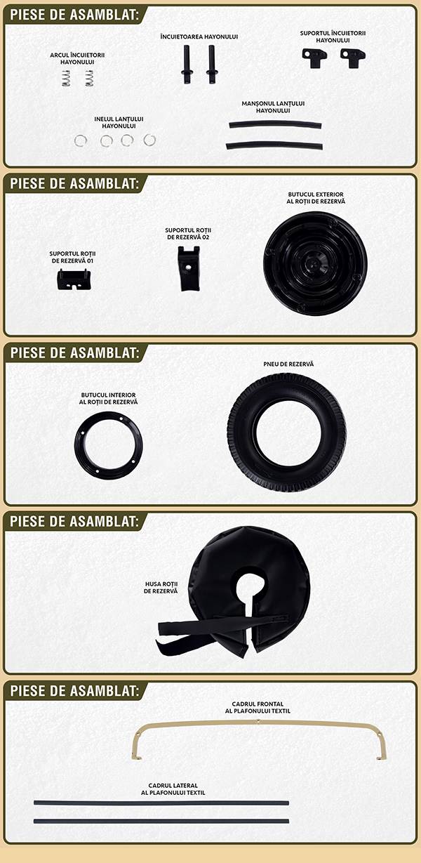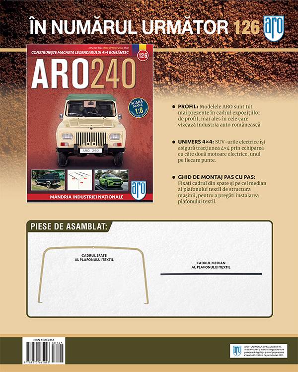 Trecand la numarul 122, vedem primele piese al rotii de rezerva. Primim prima jumatate de janta si sistemul de prindere pe oblon. Prindem flansa principala pe janta si sistemul de tip balama pe acesta. La fel ca la oblon, as recomanda mai stranse suruburile, roata fiind grea, sa nu se balanseze foarte mult. In numarul 123 primim cealalta jumatate de janta si anvelopa. Le montam conform revistei asa cum ne-am obisnuit deja de la celelalte 4 roti si trecem la numarul 124, unde vine husa rotii. Aceasta va proteja si imbraca roata, si cu ajutorul urechilor cusute pe aceasta, facem un fel de nod si le ascundem frumos. Prindem sistemul de rabatare pe oblon si intoarcem roata spre interior. Verificam sistemul de rabatare sa functioneze corect si putem inchide oblonul final. In ultimul numar al pachetului, numarul 125, primim prima parte a sfarsitului machetei si anume, arcada mica din fata a prelatei si doua dintre barele laterale, pe care le prindem intre ele, dar le lasam deoparte pentru urmatorul numar.