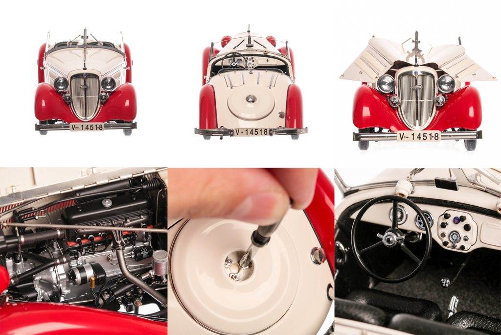 Pentru ca tot am vorbit de acest producator la general, recent am adus si noi un model deosebit din putinele modele pe care acestia le ofera. Este vorba de un Audi 225 Roadster, de care ramai uimit atunci cand il scoti din cutie. Pe langa ambalare, gandita special ca piesele si macheta sa nu se deterioreze sau macar sa se zgarie pe timpul transportului, acestia ofera un mic atelier in acelasi pachet, prin care poti asambla anumite componente sau poti dezatasa anumite piese, la fel cum faci la masina reala. Spre exemplu, roata de rezerva din partea din spate, cu ajutorului unei mini tubulare din cutie poate fi detasata de masina desfacandu-i prezoanele.