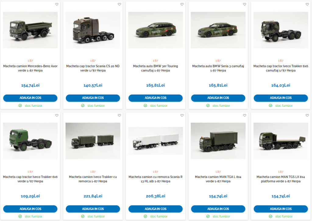 - Automobile - Herpa produce modele de mașini la scară mică, care sunt reprezentative pentru diferite epoci și branduri auto, inclusiv modele istorice și modele de curse.