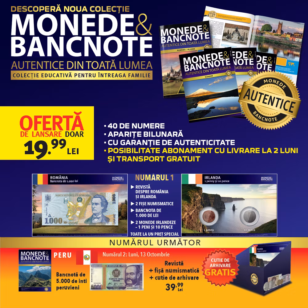 Conținutul acestui abonament (primele 4 numere)Nr.1 – Bancnota românească de 1000 lei Mihai Eminescu + două monede Irlanda (1 penny și 10 pence) – Pret promoțional: 19,99 Lei